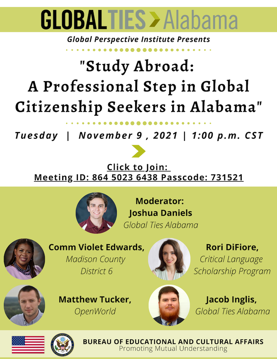 The Global Perspectives Institute, initiated in 2009, is a partnership between the International Council Services of AL and University of Alabama in Huntsville’s International Program and Services and was designed to reach a broad audience in Madison County. In 2012, the Global Perspectives Institute expanded to the campuses of the University of North Alabama, the University of Alabama in Birmingham, Oakwood University, and Alabama State University.
