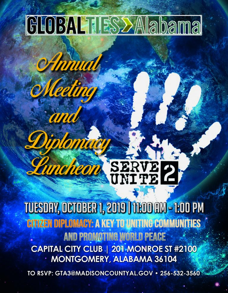 We are pleased to announce that the founders of Serve 2 Unite will be the keynote presenters at Global Ties Annual Meeting and Diplomacy Luncheon at 11 am on Tuesday, October 1, 2019 at Capitol City Club in Montgomery, AL.